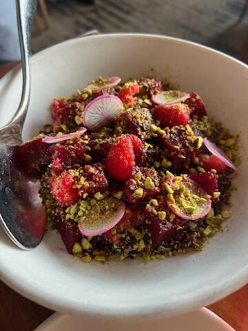 From the moment we arrived, our waitress made us feel seen and heard with attentive and warm service that set the tone for the evening. Her insight into the menu, cocktails and pairings was remarkable. The seasonal cocktail menu was a standout—each drink we tried was a perfectly crafted blend of fresh, unique, and local flavors. The steak tartare was a true highlight—delicately seasoned, with a perfect texture that melted in our mouths. It paired beautifully with the cocktails, and together, they set the stage for a truly memorable meal. The Rustic Canyon was a great addition to our California trip. We can't wait to return!