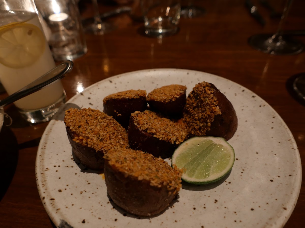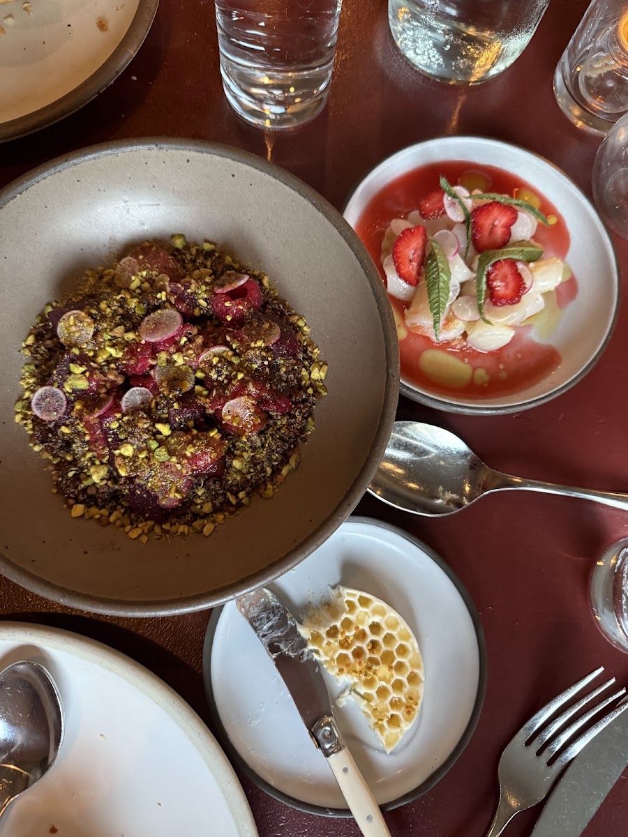 Enjoyed our 1 year wedding anniversary here - what an experience. Kicked off with the bread and honey butter. Enjoyed the beet salad (must have) with crudo (unique with strawberries and mint). The sea bass and steak were so tasty too, could even eat the fish skin. The corn was out of this world too. Paired with wine and ice cream, one of the best meals we’ve had in a while. Service and ambiance were top notch too.