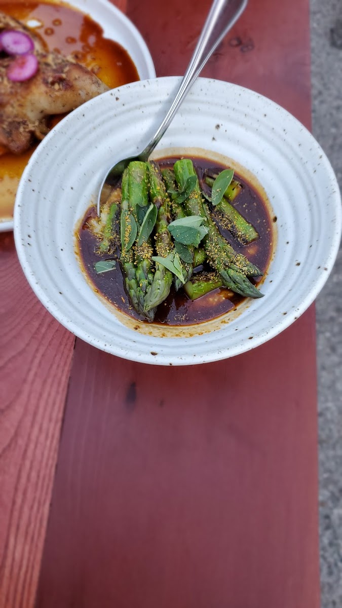 How have I put off going here for so long?? We had a res at 6pm on a Friday night and at first we were some of the only diners at the restaurant, but soon families and couples poured in to make a likely ambiance. The aesthetic of the restaurant was rustic but chic. Our waiter was super helpful with recommendations and how many plates to order for 2 people. We actually went with most of his recommendations and they did not disappoint. We started with the steak tartare that comes with pan fried sourdough bread, which was some of the best tartare I’ve ever had, and the tomato salad which was actually insane. I could have licked the sauce on the bottom of the plate and I used some of the bread from the steak tartare to soak it up. Crazy good start to the meal. Our waiter said the corn was the most popular dish at the restaurant, and we quickly realized why. It was like elote on crack but better, so insanely good. For our main entree, we shared the pork chop which came with a chimichurri sauce and cherries. Never had this flavor combo before but it worked! The pork was perfectly cooked and the sauces gave it an herbal and sweet note. Perfection really. Finally, for dessert we had the peach Melba and it was so simple but I can’t stop thinking about it. Fresh peaches, whipped cream, and crumbled crust or cookies. Don’t skip dessert, folks! We can’t wait to come back to Rustic Canyon. Farm to table at its finest and amazing, yet thoughtful service. Thanks for an amazing meal!